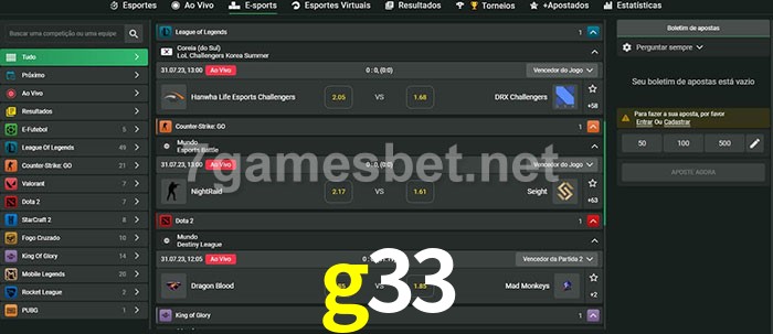 O g33 oferece uma grande seleção de opções de apostas em e-sports com probabilidades competitivas